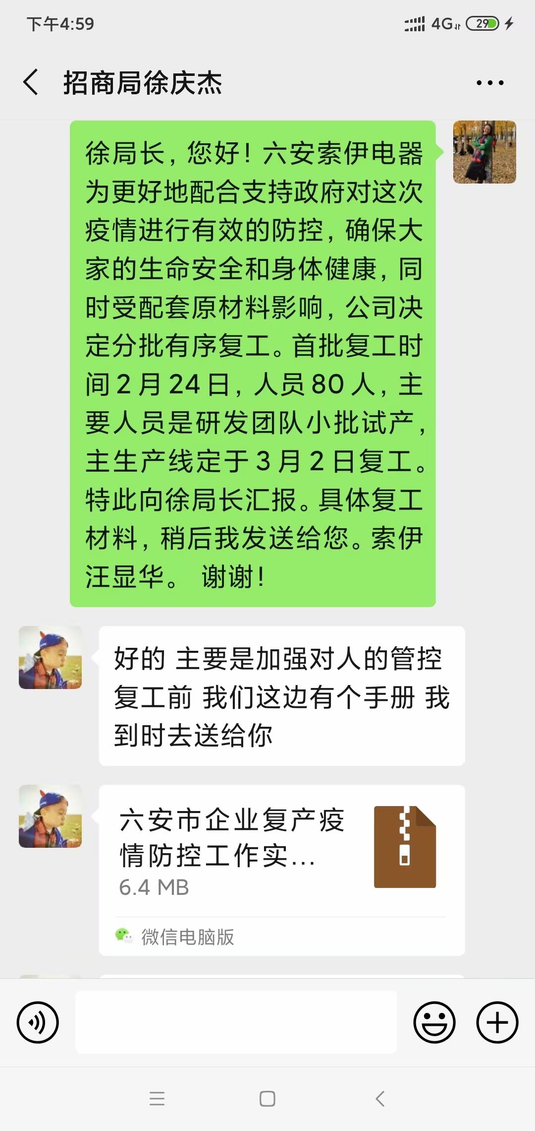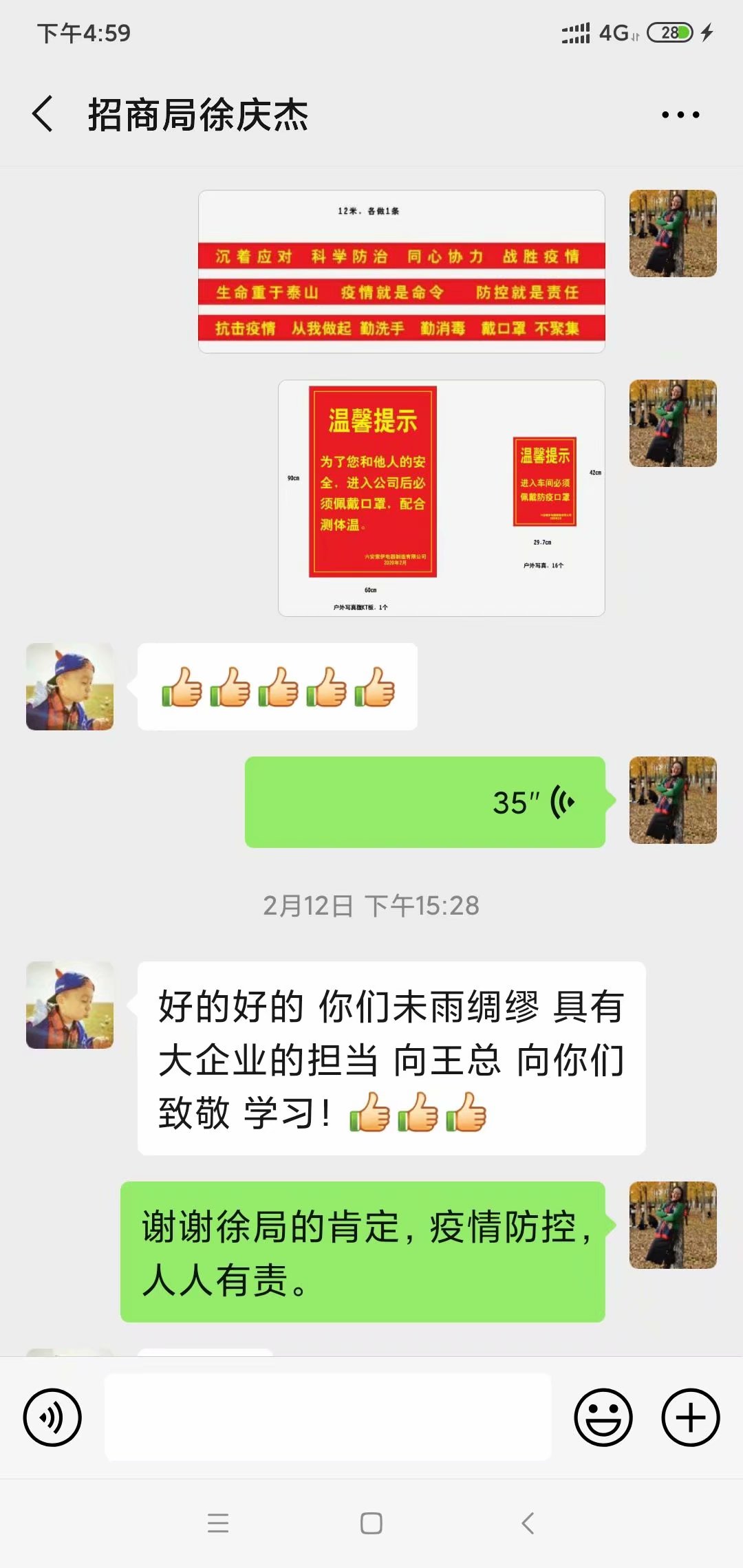開發區派駐到我們索伊集團的督導員是來自開發區招商局副局長徐慶杰,是一位年輕的,很帥氣,也很有親和力的80后領導。作為索伊集團防疫總指揮的我,第一次與他接觸時是二月十二日,當時我還放假在家,他主動打電話與我聯系,我當時不認識他,也從沒有接觸過他,他發送了一張名片也算是自我介紹吧,我才知道他叫徐慶杰,來自開發區招商局。他說他這次包保我們單位,我們倆很快加了微信,他第一時間把《六安開發區關于復工企業新型冠狀病毒防疫防控指導細則》、《復產復工外出來人員返工情況表》和政府的8號通告發送給我,同時還指導我如何制定防控預案,這些信息真是雪中送炭,正愁著馬上復工了,如何來向政府報告,一愁莫展時,他給予我很大的指導,同時還把《致市民的倡議書》音頻資料發送給我,讓我們在復工復產的時候在廠區內進行播放,通過微信我得到了很多的信息和幫助。接下來的幾天時間里,只要有新信息,他都及時發送給我,并主動與我交流,希望在復工時一切都能有序安全。