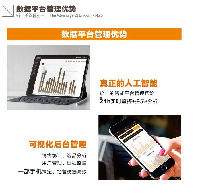 口味更多更營養:索伊超大8+1料盒組合,兼顧熱飲、冷飲、冰飲等多種口味,使得現磨咖啡、現調奶茶、草本養生、冰鎮飲品等40余種飲品一機實現;24小無人值售;數據化后臺管理,維護簡單方便;支持刷卡、掃碼,一鍵點擊,即時享用。