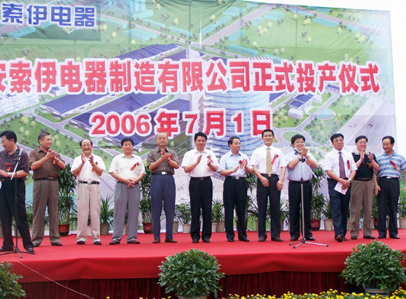 2006年7月1日,六安索伊電器制造有限公司第一條年產30萬臺電冰箱生產線建成投產。市領導倪發(fā)科、湯林祥、程世龍、汪永義、潘忠余、楊光祥、趙懷華等出席儀式。市委書記、市人大常委會主任倪發(fā)科、市長湯林祥為第一臺六安生產的索伊電冰箱下線剪彩。